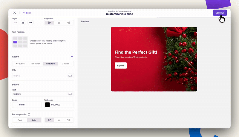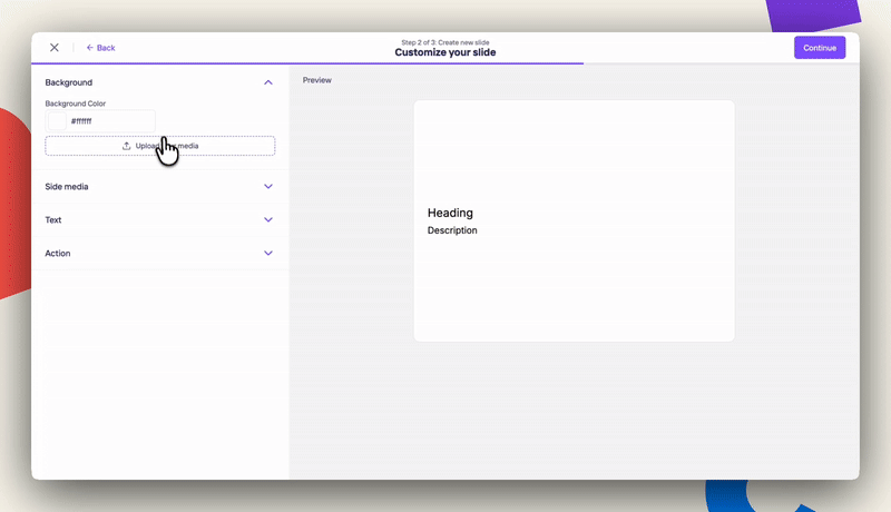 On this step, you will fully customize your banner content:- Choose a background color or upload a slide media