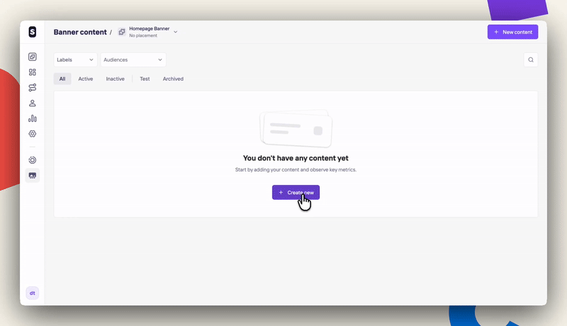 Once you have a Banner widget added at the Widget Library section and defined a design for it, you can go to the Banner content section to finally create them following the steps below: