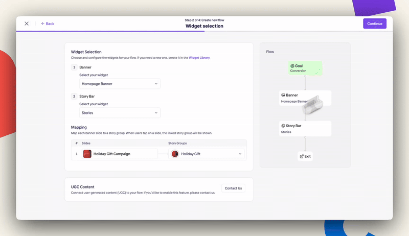 - Choose and configure the widgets for your flow. If you need a new one, please, create it in the Widget Library page.