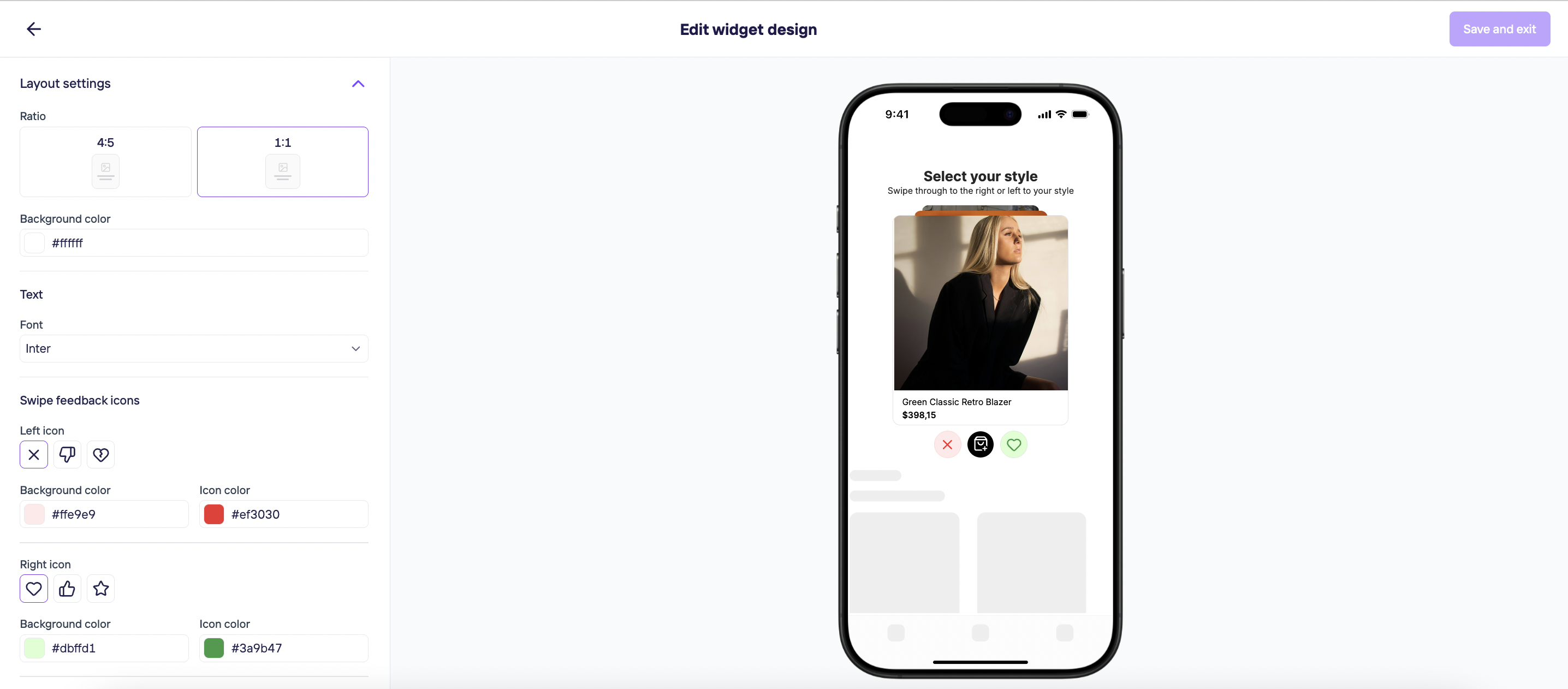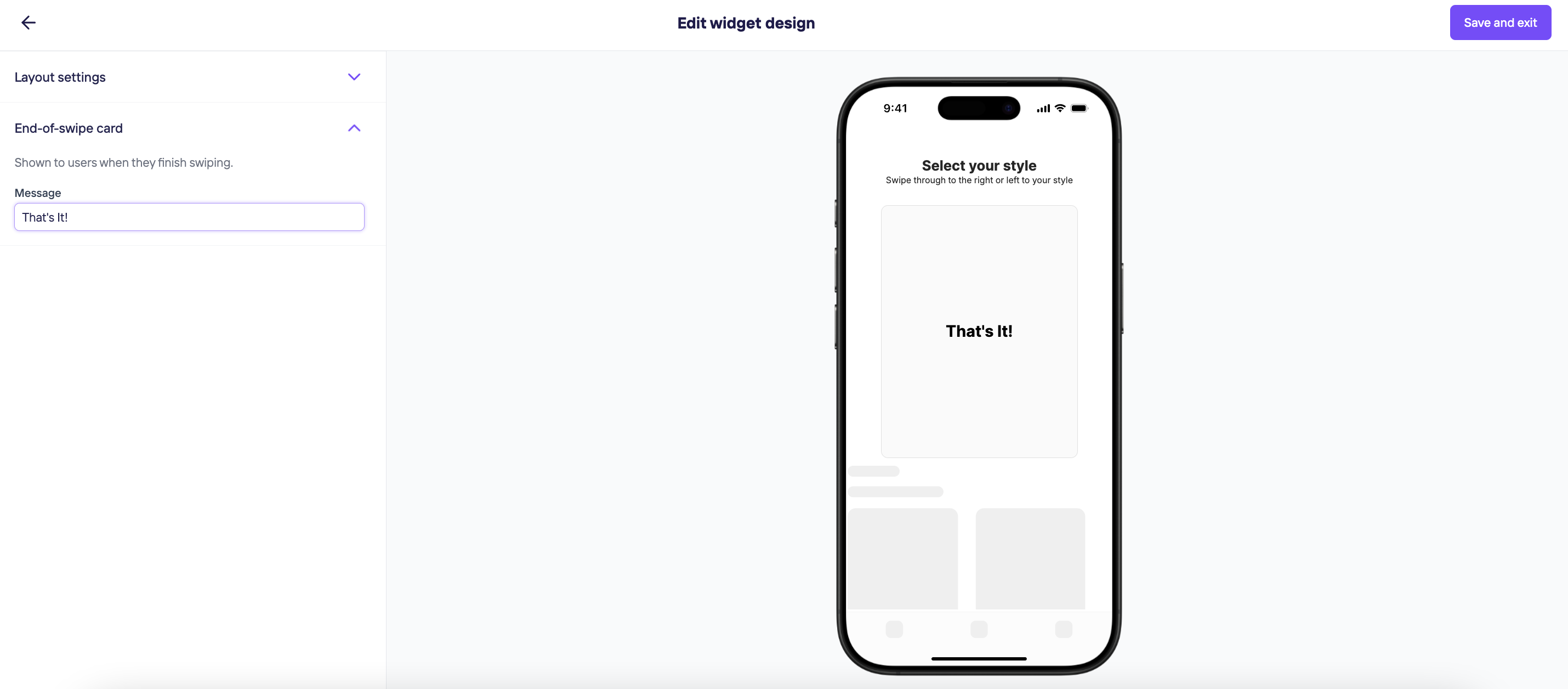 By clicking on Edit design, you decide on your Layout settings, Text font, Swipe feedback icons and End-of-swipe-card message.