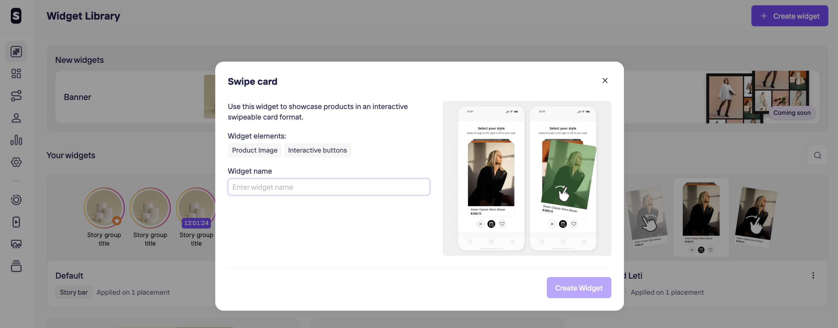 For creating a Swipe Card widget, click on + Create widget in the top left corner and chose the Swipe Card option. The next steps will be giving a unique name to help you identify it later and hit Create Widget button.