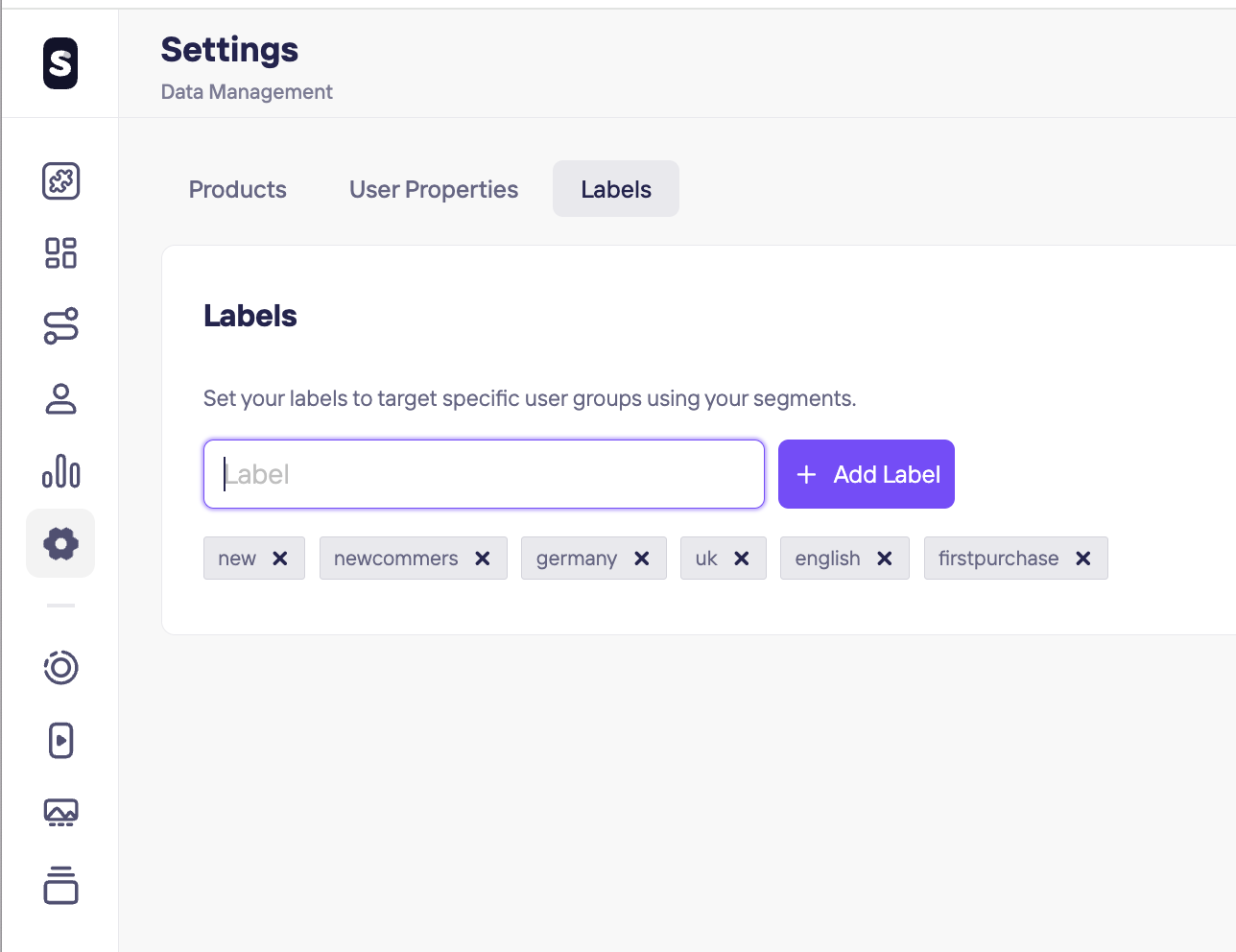 Go to Labels under the Data Management and add your labels on Storyly Dashboard to use labels on your widgets such as Story Bars, Banners, Swipe Cards.