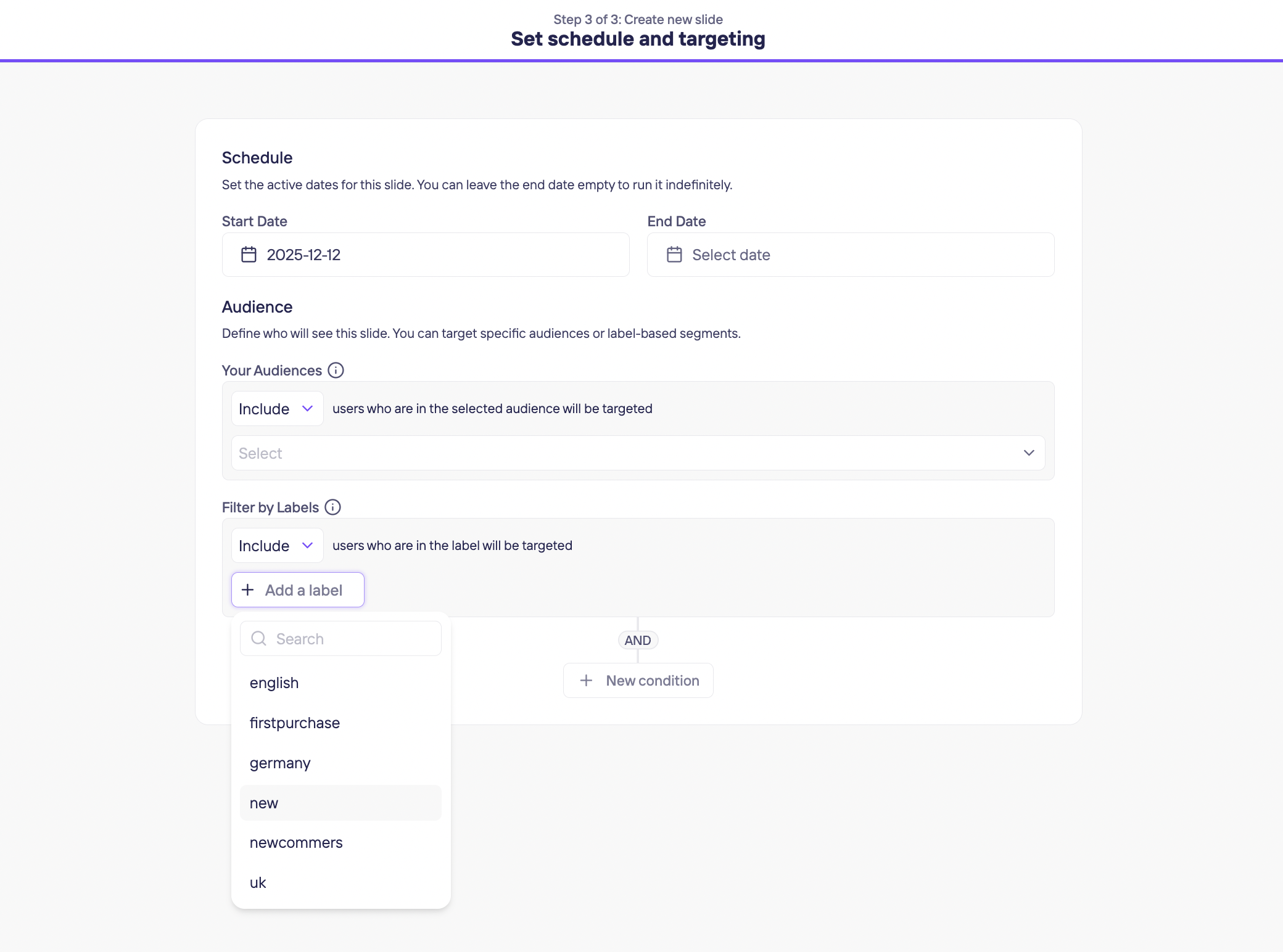 Once you've added the correct labels that will match with your customer data, click on Audience while creating content and set your labels. You can have rulesets on your labels and will have the ability to show your content to rule set audience.