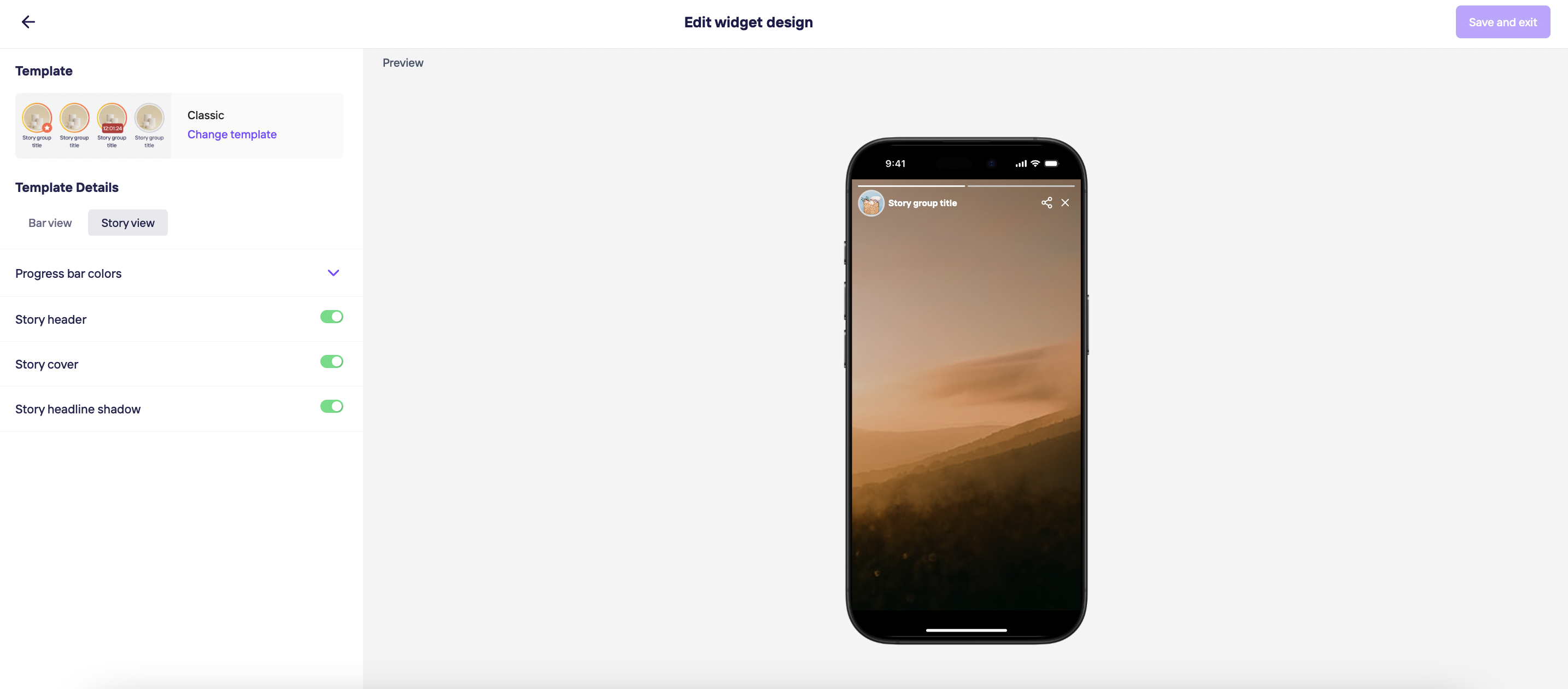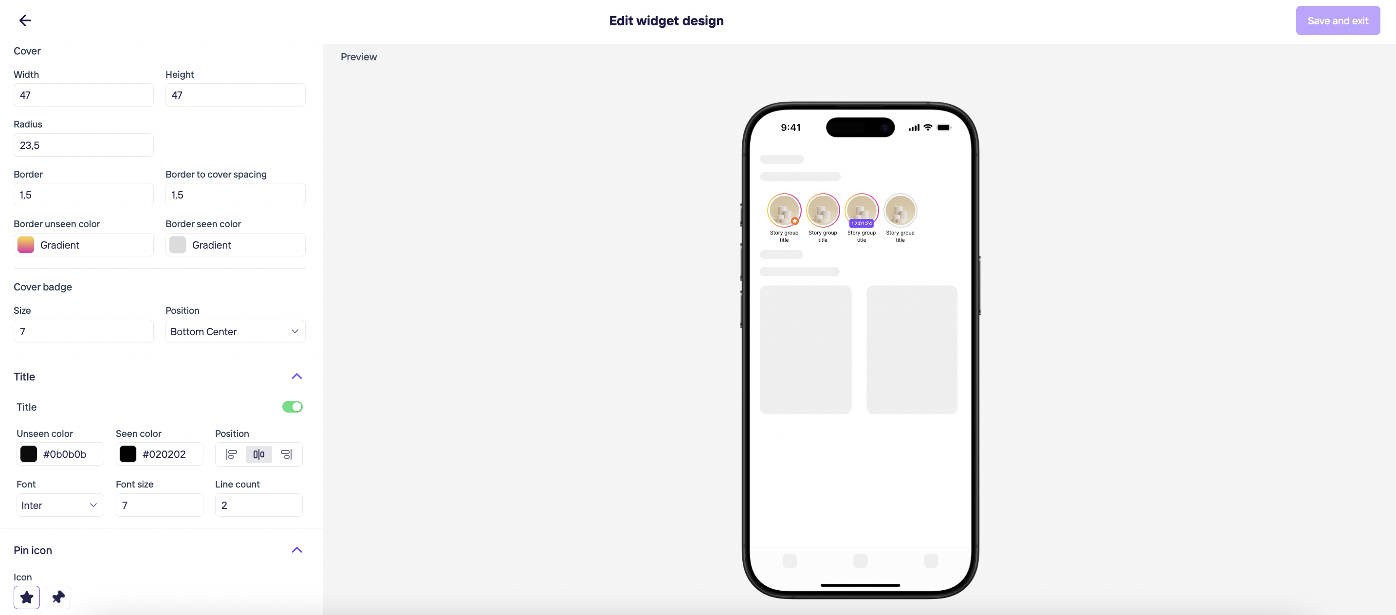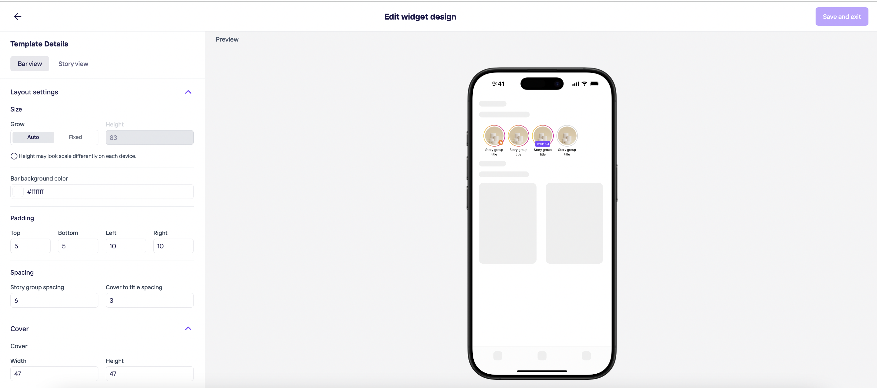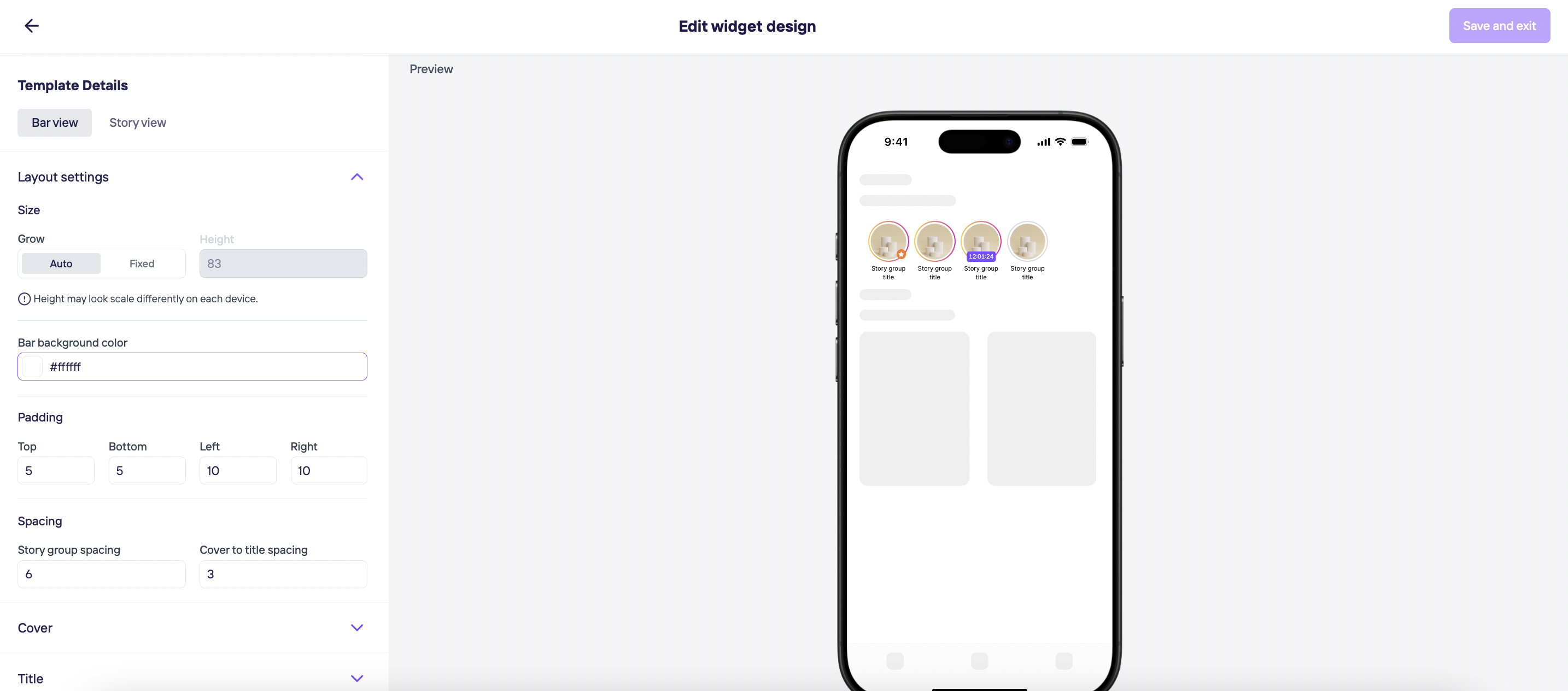 - After deciding on the style, you can customize bar view (paddings, spacing, radius, colors, text font & size & color, pin icon & cover badge positions, and enable/disable animations) and story view (progress bar colors, story header, story cover, story headline shadow). Every change you make will be reflected in the preview.