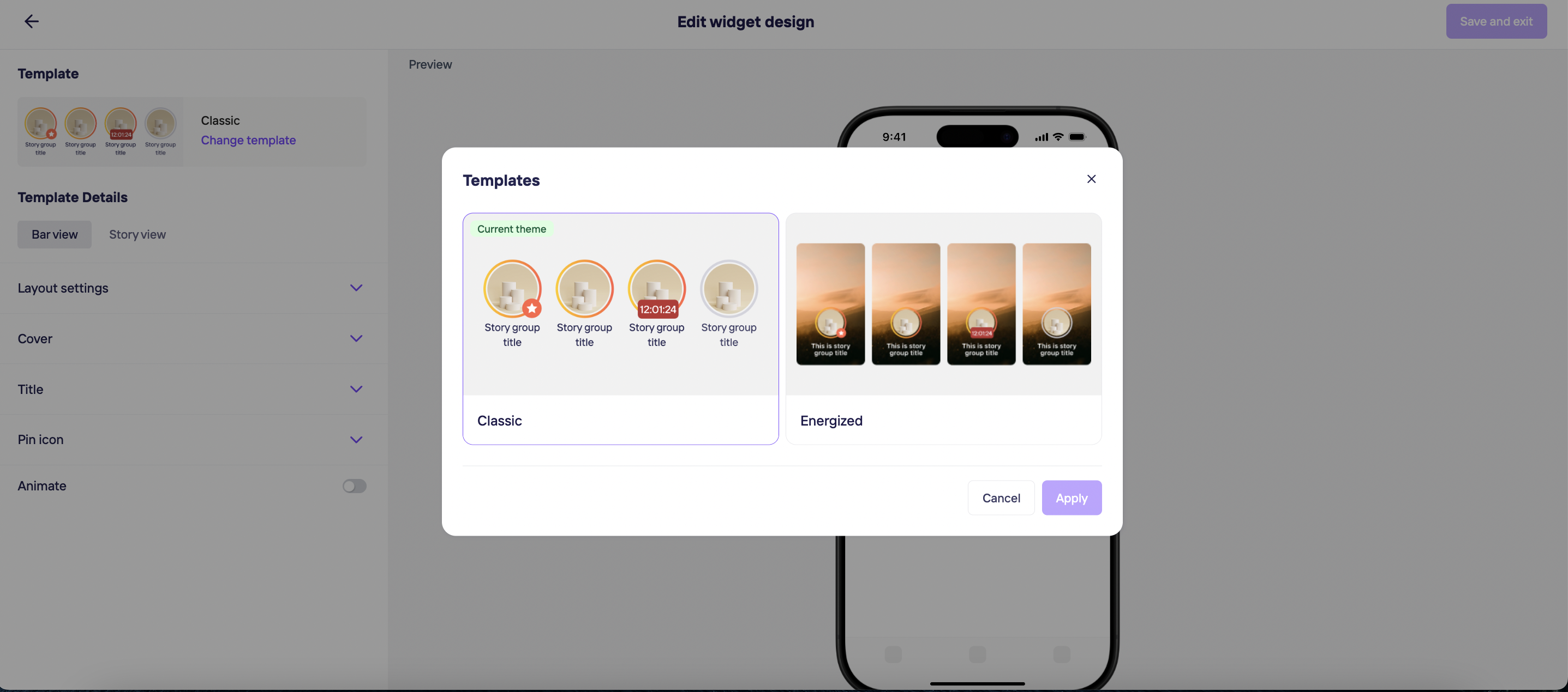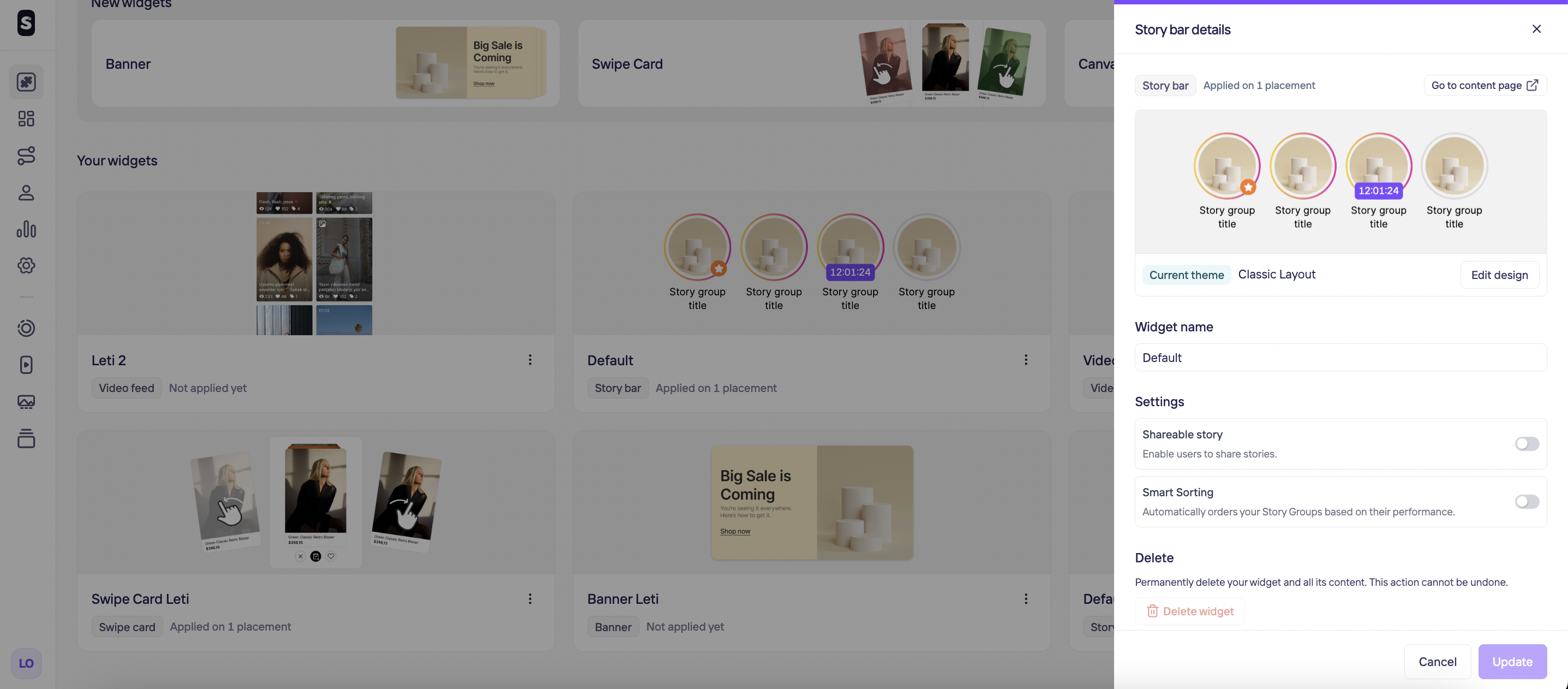 After creating your Story bar widget, you can click the 3 dots button to edit their Current theme, Layout and Settings. Or delete this widget in case you need to do it.