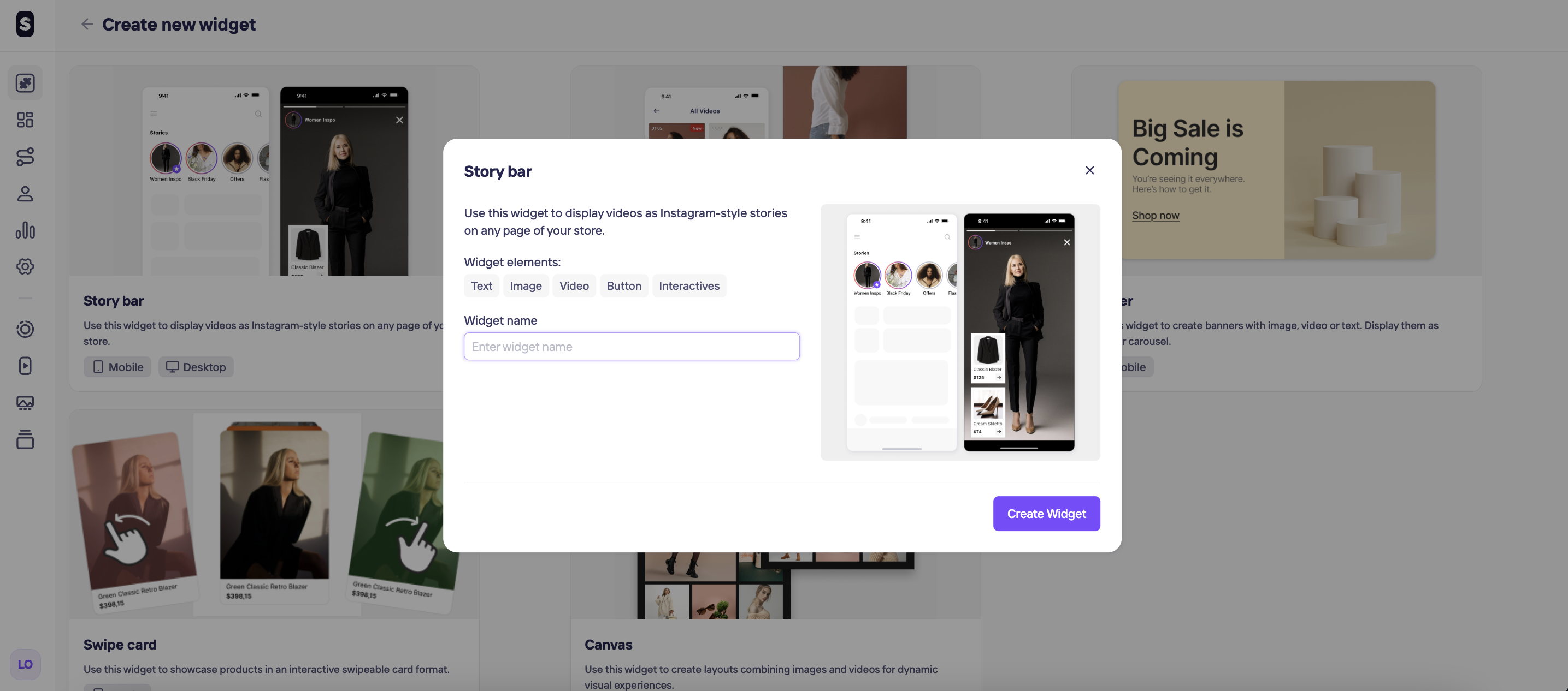 For creating a Story bar widget, click on + Create widget in the top left corner and chose the Story bar option. The next steps will be giving a unique name to help you identify it later and hit Create Widget button.